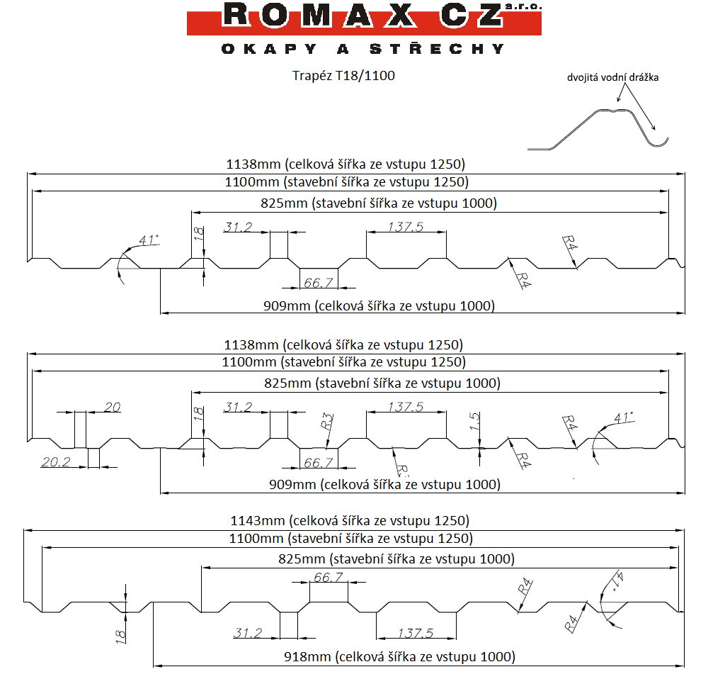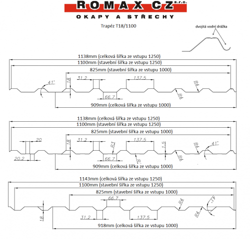Pro střechy a lichoběžníkové fasády je vhodná varianta trapézového plechu T-18 E FC, posílený žebrovanou vlnou, má velmi efektivní široké využití. Má tři výhody: efektivnost, účelnost a hospodárnost. Používá se k pokrývání zemědělských budov, stropů, přístřešků, skladů a průmyslových budov všech typů. Je vyráběn v povrchových úpravách dle přiloženého vzorkovníku.